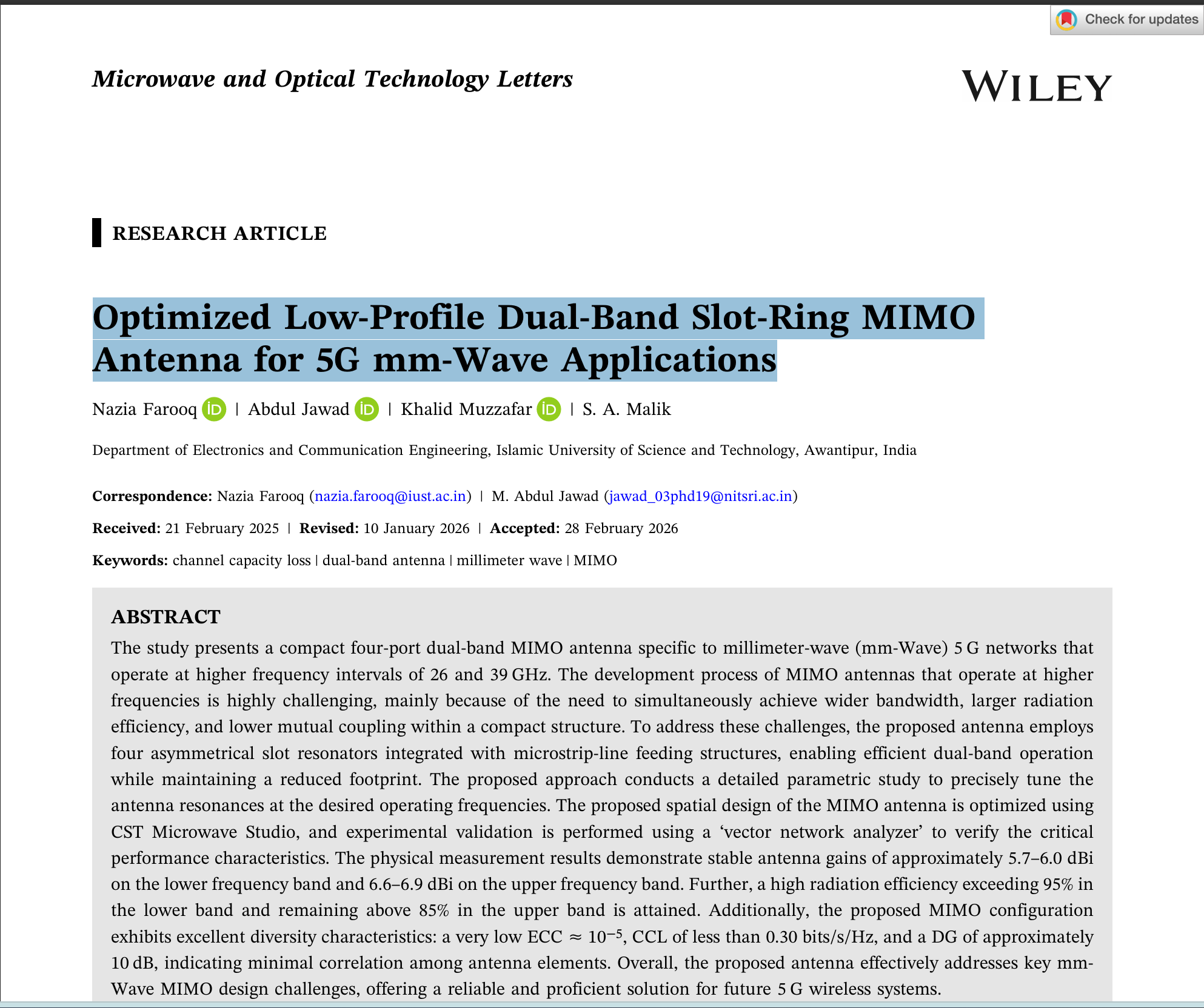 | Paper Presented / Published | Enhanced Gain Compact Millimetre Wave Dipole Antenna for 5G Communication with Meta-Material Loading | 2020 IEEE International Conference on Communication, Networks and Satellite (Comnetsat) | 978-0-7381-2517-6 | 17-12-2020 | 18-12-2020 |